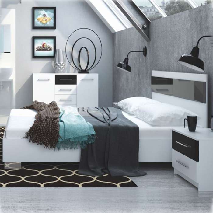 The DUBAJ bed exudes modern sophistication with its high-gloss white finish and a sleek black gloss accent on the headboard, creating a striking contrast. Built from robust 16mm laminated chipboard, this bed offers durability and style, with a generous sleeping area of 200 x 160 cm for ultimate comfort. The mattress is not included but can be conveniently ordered from our mattress collection to complete your ideal bedroom setup.
