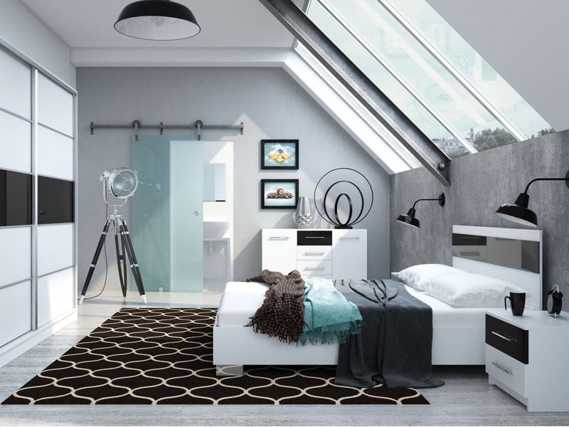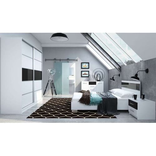 Our crisp white Dubaj bedroom set is perfectly contrasted with a broad stripe in black glass.
