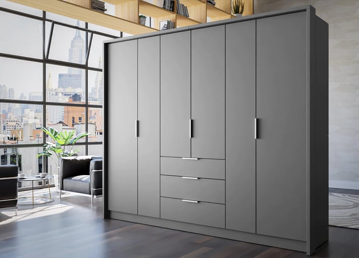 This BANGKOK 255 graphite bedroom set includes a 255cm wardrobe, a chest of drawers, and 2 bedside tables. Crafted from durable 16mm laminated chipboard, this set offers a sleek and modern design. The graphite finish adds a touch of elegance to any bedroom decor. The spacious wardrobe provides ample storage space for clothing and accessories, while the chest of drawers offers additional organisation options. The 2 bedside tables are perfect for keeping essentials within reach. With its high-quality construction and stylish graphite colour, this bedroom set is both functional and visually appealing.
