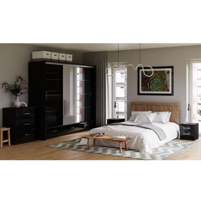 The MARSYLIA 255 black bedroom 4 piece set offers a cohesive and stylish furniture arrangement to transform your bedroom into a serene and functional space. The centrepiece of the set is a mirrored wardrobe with LED lights, which serves as a striking focal point while providing ample storage.
