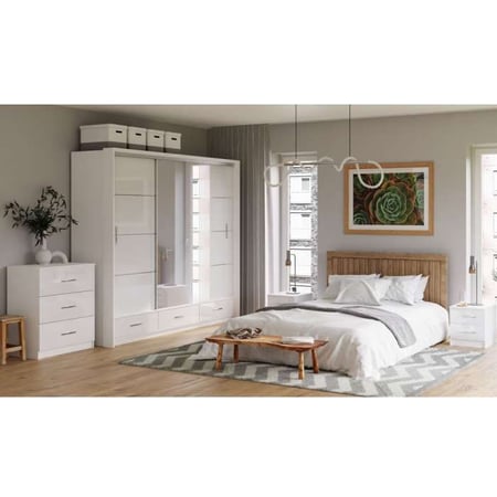 The MARSYLIA 255 white bedroom 4 piece set offers a cohesive and stylish furniture arrangement to transform your bedroom into a serene and functional space. The centrepiece of the set is a mirrored wardrobe with LED lights, which serves as a striking focal point while providing ample storage.