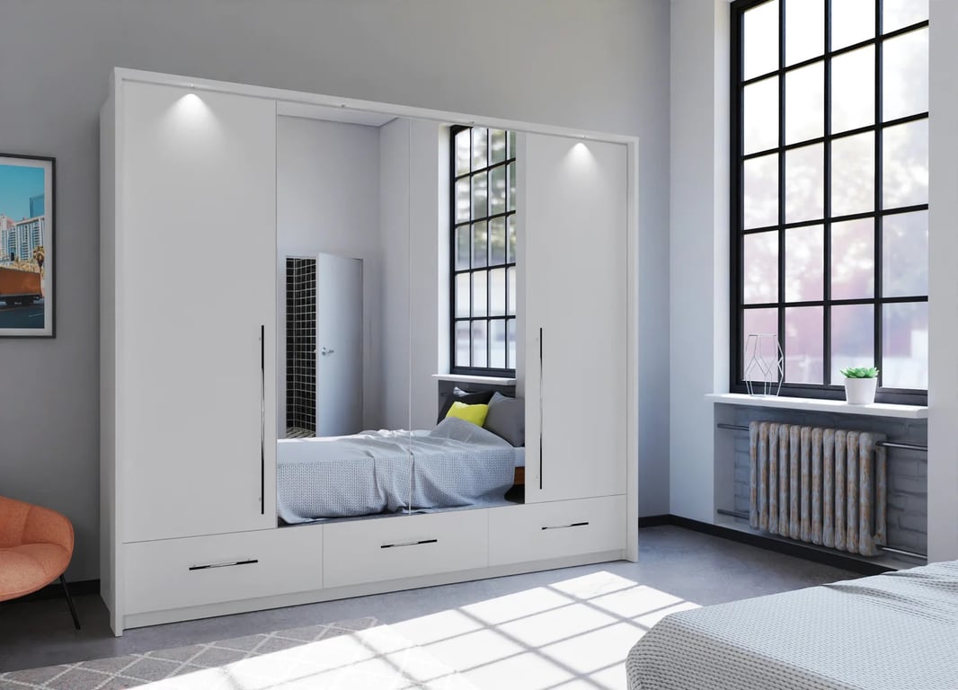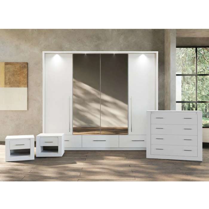 This TOLEDO 255 white bedroom set offers a cohesive and stylish furniture arrangement to transform your bedroom into a serene and functional space. The centrepiece of the set is a mirrored wardrobe with LED lights, which serves as a striking focal point while providing ample storage.