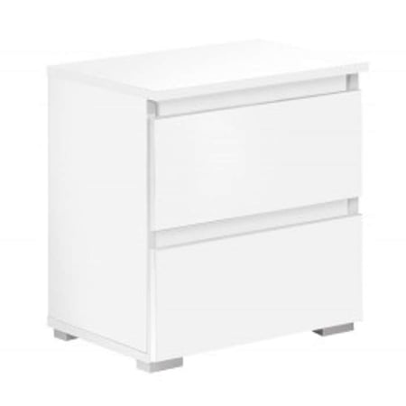 Sleek and modern bedside table in crisp white, crafted from durable 16 mm laminated chipboard. It's designed with meticulous detail, featuring 0.5 mm ABS edging for a seamless finish. The table is practical yet elegant, equipped with two smoothly gliding drawers on roller guides, offering ample storage space. With dimensions of 40 cm in width, 36 cm in depth, and standing at a height of 45.5 cm, it's perfectly proportioned to complement any bedroom decor, adding both functionality and style to your bedside area.