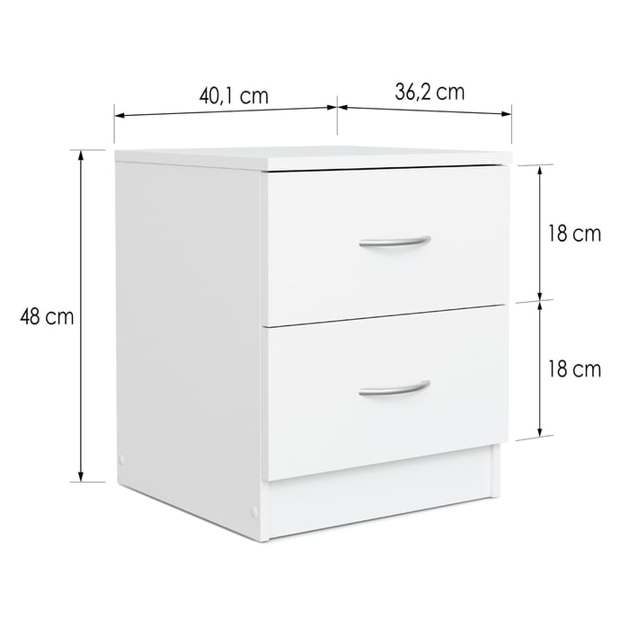 The bedside table ESSENTIAL 2D is crafted from 16 mm thick laminated chipboard, providing excellent durability and resistance to everyday wear. It features 2 full-width drawers on metal glides that opens smoothly and quietly.