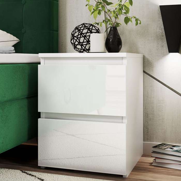 This white/white gloss bedside table offers a sleek, modern look that brightens any bedroom. Its smooth, glossy finish complements contemporary interiors while providing practical storage with spacious, handleless drawers.