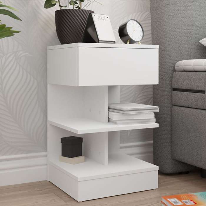 The OLIVE bedside table in white features a sleek drawer and open shelves for storage, combining modern design with practicality for any bedroom.
