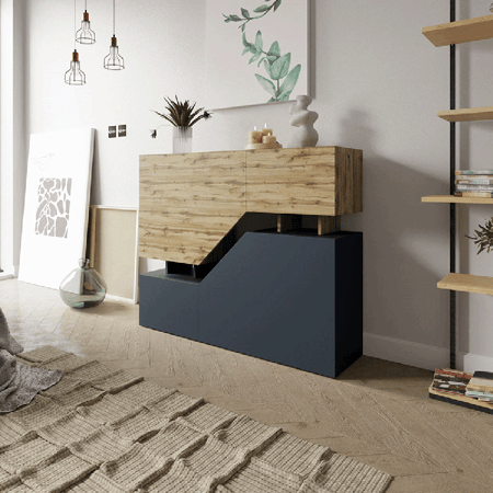 The modern Cabinet CELICA stands out with its striking designer look. The asymmetrical fronts form an intriguing pattern that serves as the centrepiece of any living room. The carefully chosen colour combination adds a fresh, slightly futuristic touch to your space. Inside, the cabinet offers ample storage with closed cabinets, perfect for organising gadgets, books, records, and accessories. The open spaces, even when empty, enhance the overall aesthetic, making this piece a beautiful and functional addition to your living room.