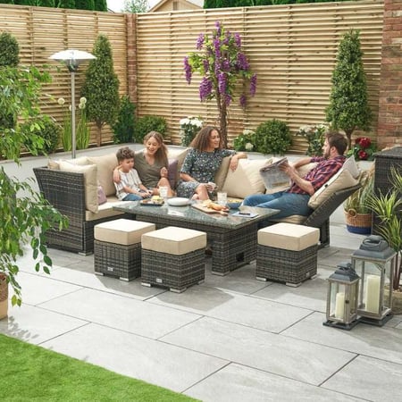 Stylish rattan corner set with rising table, reclining sides & seating for 6. Weatherproof & comfy—perfect for relaxing or dining outdoors year-round.