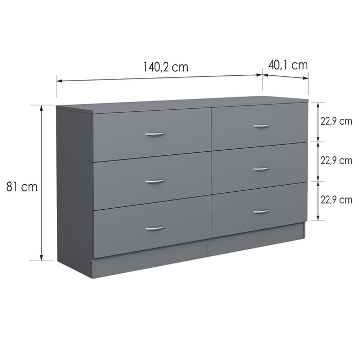Each of the six drawers is uniformly 22.9 cm high, allowing for a balanced aesthetic and optimal internal space. The horizontal layout is especially convenient for organizing a variety of items — from clothing and linens to office supplies or media.