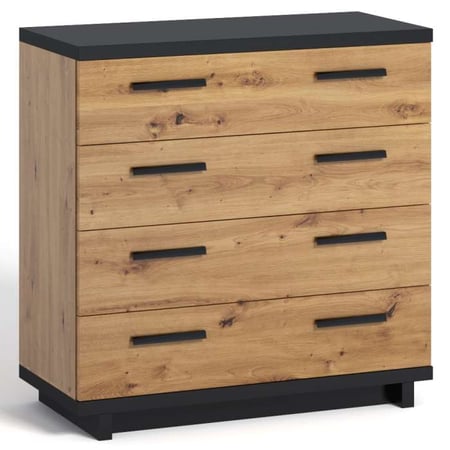 The INEZO chest of drawers is versatile, suitable for the bedroom, living room, or hallway. It features a timeless black finish complemented by warm artisan oak tones, blending modern aesthetics with classic appeal. Crafted from high-quality chipboard, the construction ensures durability. Furthermore, it includes four spacious drawers, offering ample storage capacity.