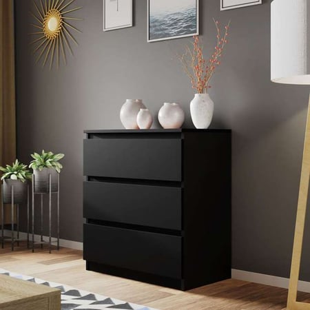The MOLAMA M3 chest of drawers in black adds a touch of modern elegance to any room. Its sleek, dark finish complements various interiors while providing practical storage with three drawers.