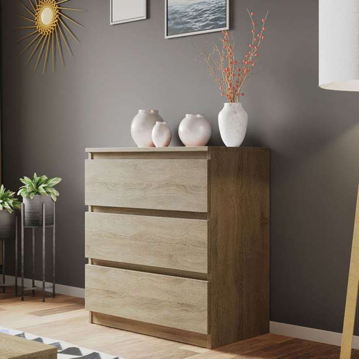 The MOLAMA M3 chest of drawers in oak sonoma brings a warm , natural look to your space. Its light, wood-inspired finish adds a touch of cosiness while offering practical storage with three drawers.