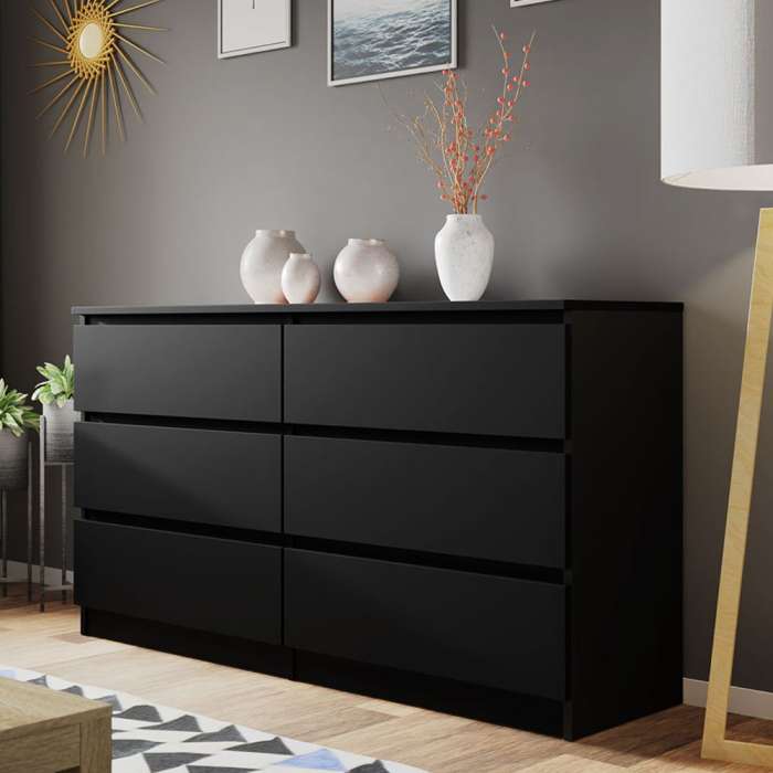 The MOLAMA M6 140 chest of drawers in black adds a touch of modern elegance to any room. Its sleek, dark finish complements various interiors while providing practical storage with six drawers.