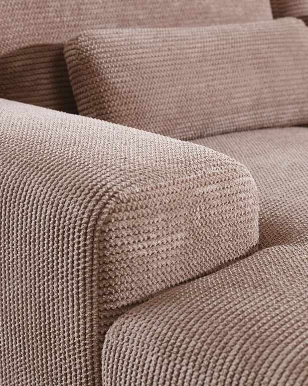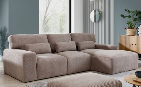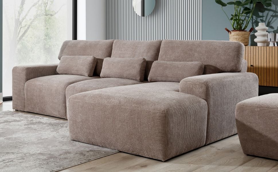 AMERIZZO is a modern L-shaped corner sofa featuring soft ribbed fabric, loose back cushions, and a wide chaise for superior lounging comfort. Its clean lines and low-profile design make it a perfect fit for contemporary interiors, offering both style and everyday functionality.
