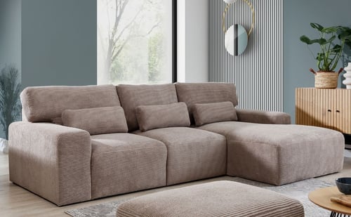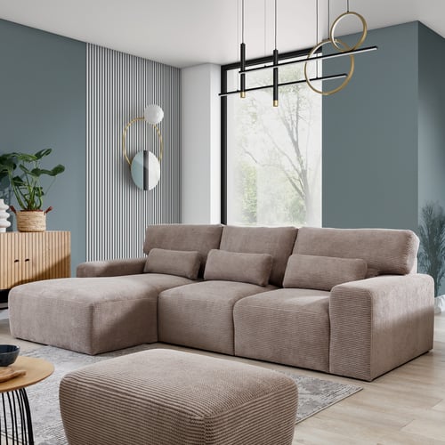 Discover the AMERIZZO L-shaped fabric corner sofa right – modern design, wide chaise, and soft ribbed upholstery. Perfect for stylish and practical living rooms.