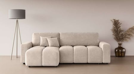 The Corner Sofa Bed LAINEY offers a versatile design with a convenient sleeping function, spacious storage container, and two decorative cushions. Perfect for maximising space, comfort, and style in any room.