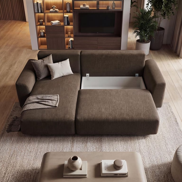 Keeping your living room tidy is easy with LORRAINE'S integrated bedding storage compartment. Hidden neatly beneath the chaise, the spacious compartment provides plenty of room for duvets, pillows or blankets. This smart feature allows you to keep essentials close at hand while maintaining a clutter-free interior. Simply lift the seat section to access the storage.