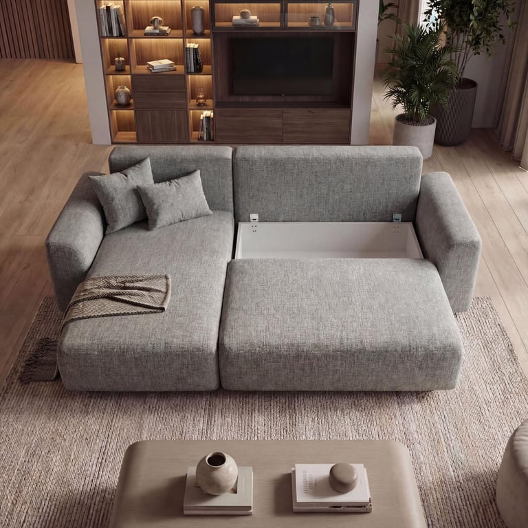 Keeping your living room tidy is easy with LORRAINE'S integrated bedding storage compartment. Hidden neatly beneath the chaise, the spacious compartment provides plenty of room for duvets, pillows or blankets. This smart feature allows you to keep essentials close at hand while maintaining a clutter-free interior. Simply lift the seat section to access the storage.