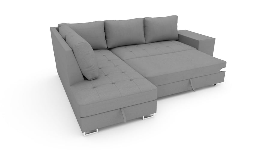 This modern corner sofa bed MARTHA is the perfect combination of style, comfort, and functionality. Upholstered in grey fabric, it complements any décor while providing a cosy seating and sleeping experience. The wave springs and foam filling ensure excellent support and long-lasting comfort. Featuring a convenient click-clack mechanism, it easily transforms into a spacious bed in seconds. A built-in storage compartment adds extra practicality, offering a discreet space for bedding and essentials. Ideal for any home, this versatile sofa is perfect for relaxing, hosting guests, or maximising space.