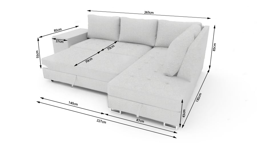 A 263 cm-wide, 185 cm-deep, 85 cm-high corner sofa bed offers spacious seating and a comfortable sleeping area. Its corner design maximises space, making it ideal for lounging, entertaining, or hosting guests while enhancing any living area’s style and functionality.