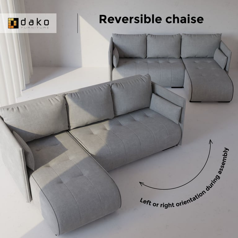 The L-shaped sofa bed NESSA adapts to your room layout with ease thanks to its reversible chaise design. During assembly, you can position the longer section on either the left or the right side, ensuring a perfect match for your space. This flexibility also means the sofa can be reconfigured if you rearrange your room or move home in the future.