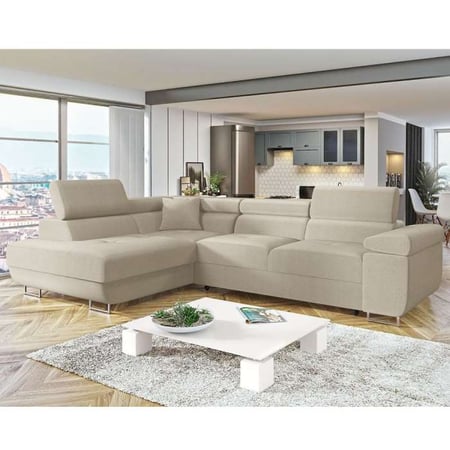 The Corner Sofa Bed TORNADO features a sleeping function, storage container, and adjustable headrests, offering comfort and practicality in a stylish design.