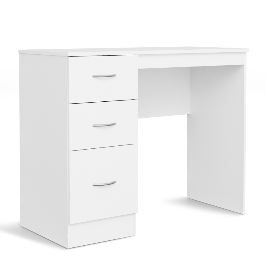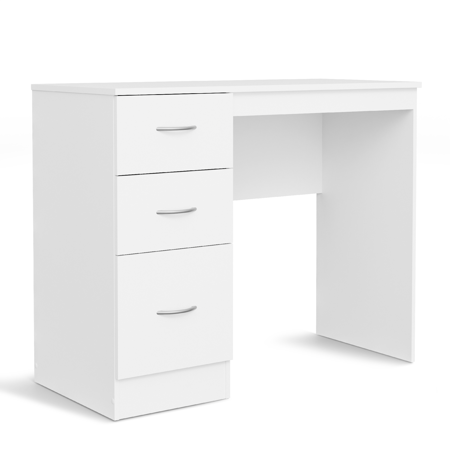 This stylish and functional desk is crafted from high-quality laminated board, ensuring durability and resistance to everyday wear. The front panels are made from matte-finished laminated board, giving it a sleek, modern look with a smooth, elegant texture. It features three spacious drawers that glide effortlessly on sturdy metal runners, perfect for storing office essentials or personal items. The curved silver handles add a touch of sophistication, while the plastic feet provide stability and help protect your floors. With its practical design and premium materials, this desk is a perfect blend of form and function for any workspace.