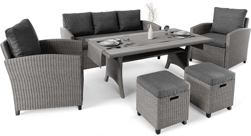 The set includes a three-seater sofa, two armchairs, two ottomans, and a dining table with a spacious tabletop. The seats and backrests are equipped with soft cushions, ensuring maximum comfort.