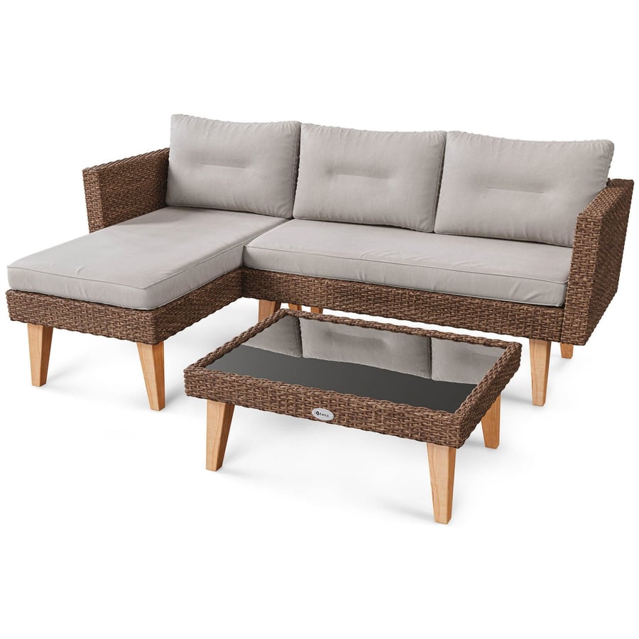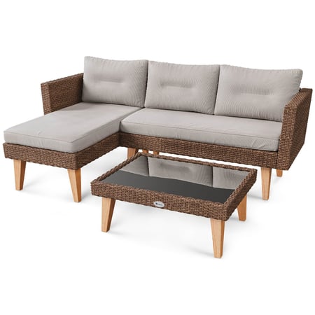 The furniture is constructed with a sturdy steel frame, handwoven with weather-resistant technorattan, ensuring long-lasting durability. Acacia wood legs add a natural touch to the design, blending harmoniously with the overall look of the set.