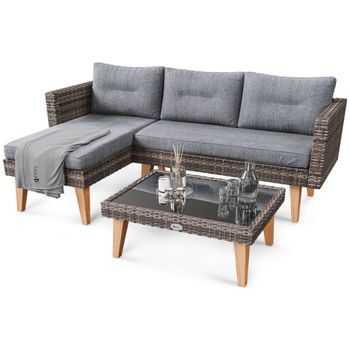 The furniture is constructed with a sturdy steel frame, handwoven with weather-resistant technorattan, ensuring long-lasting durability. Acacia wood legs add a natural touch to the design, blending harmoniously with the overall look of the set.