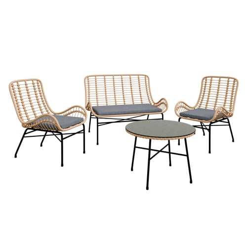 Enhance your outdoor living area with the DAKO MANOLI garden furniture set, where natural aesthetics meet modern durability. Designed for comfort, style, and practicality, this set brings effortless charm to patios, terraces, and garden lounges. The light rattan-look finish paired with black legs and grey cushions creates a welcoming and contemporary atmosphere.