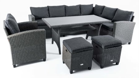 garden furniture is a large corner sofa, a comfortable armchair, two stools and