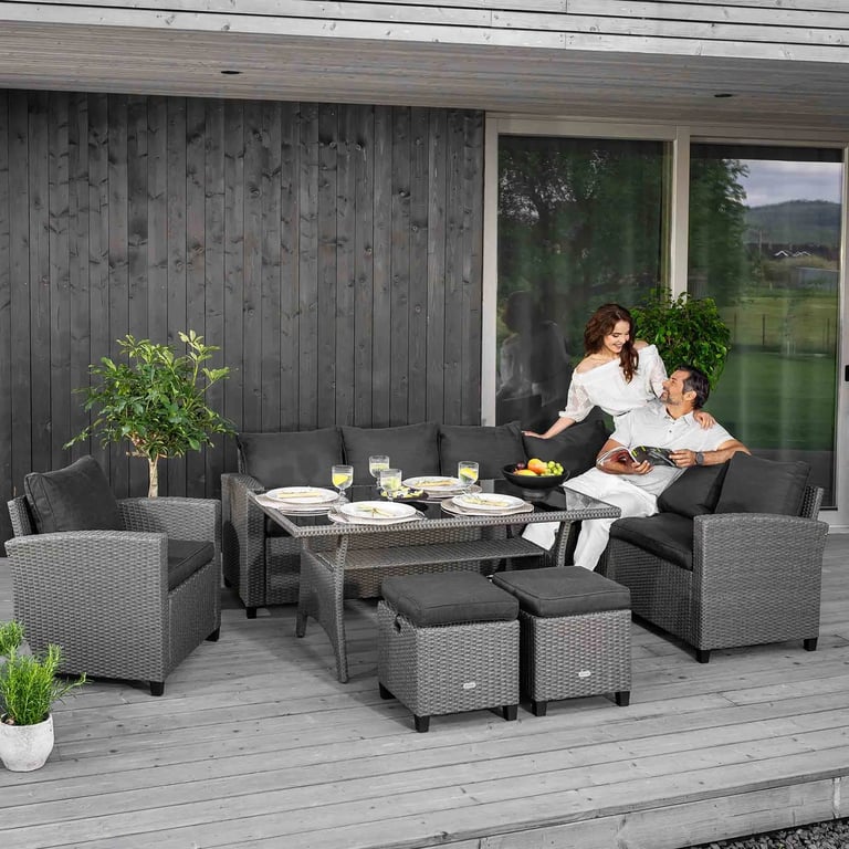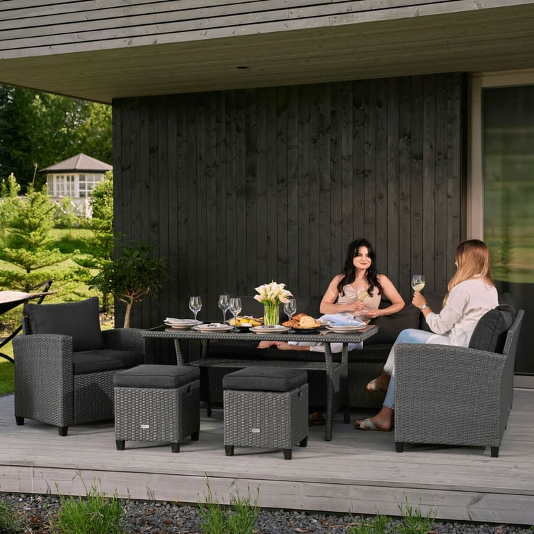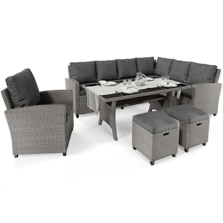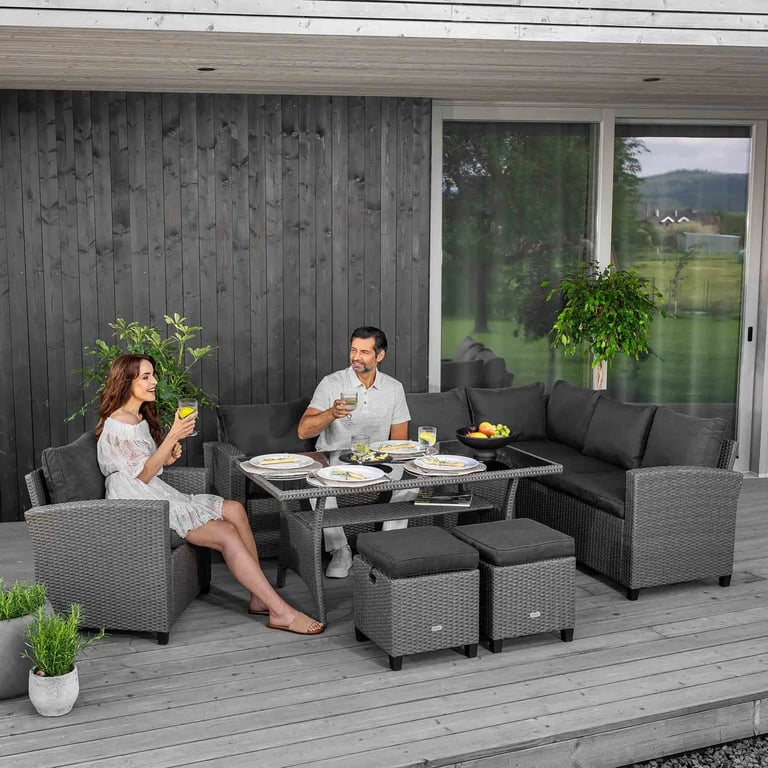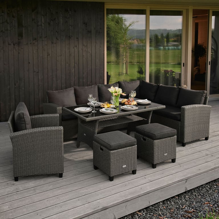 The ROSSANO set by di volio is a comfortable and functional garden furniture set, perfect for use on a terrace, balcony, or in a garden gazebo. The furniture is made from high-quality polyrattan, known for its excellent resistance to weather conditions, extreme temperatures, and UV rays. Each piece is handwoven with great attention to detail. Thanks to the rounded fibres, the weave closely resembles natural rattan, giving the furniture an elegant and natural look. Soft, thick cushions on the seats and backrests ensure maximum comfort during use. The set includes a large table, an armchair, two footstools, and a corner sofa. From now on, whether you're hosting a garden party or enjoying seasonal barbecues, there will always be enough space for all your guests. The multi-element ROSSANO garden furniture set provides the comfort you need.