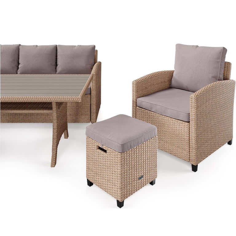 The high-quality rounded technorattan fibers give the furniture a natural look, enhancing its elegant appeal. The combination of woven details with modern, minimalist forms creates a versatile design that seamlessly fits into both contemporary and traditional outdoor spaces.