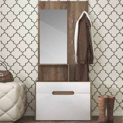 This stylish and functional hallway unit combines practicality with modern aesthetics, featuring a wood finish and white gloss for a sleek, contemporary look. Constructed from 16 mm laminate chipboard, it offers durability and resistance to daily wear and tear. It includes a spacious cupboard for shoes or other essentials, a drawer with smooth metal runners for smaller items like keys or accessories, and a sturdy hook for hanging jackets or bags. The large mirror adds both functionality and a sense of openness, making it a perfect addition to any modern entryway.