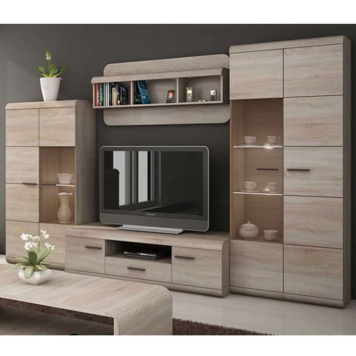 The set consists of four distinct elements: a tall display cabinet with a glass front section, ideal for showcasing your favourite items; a central TV cabinet with a dedicated space for a digital decoder; an attractive wall shelf positioned above the TV cabinet; and another display cabinet with a partially glass front, perfect for combining storage and display functionality.