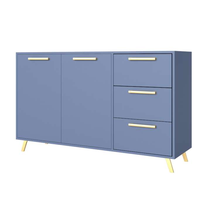 This elegant sideboard in a rich blue colour adds a touch of luxury and modern charm to any living space. Featuring stunning golden legs and handles, it effortlessly blends bold colour with sophisticated metallic accents. Crafted from durable 16 mm laminated chipboard, it ensures lasting quality while providing ample storage with spacious compartments for your belongings. The combination of its sleek design, vibrant blue finish, and gold details makes it a perfect centrepiece to elevate your décor and keep your space organised in style.