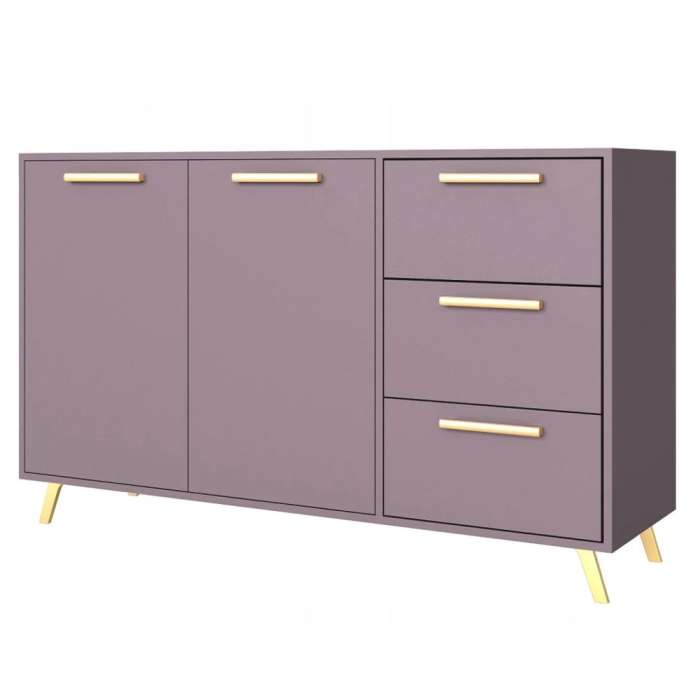 This elegant sideboard in a rich plum colour adds a touch of luxury and modern charm to any living space. Featuring stunning golden legs and handles, it effortlessly blends bold colour with sophisticated metallic accents. Crafted from durable 16 mm laminated chipboard, it ensures lasting quality while providing ample storage with spacious compartments for your belongings. The combination of its sleek design, vibrant plum finish, and gold details makes it a perfect centrepiece to elevate your décor and keep your space organised in style.