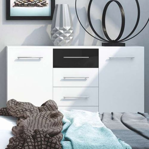 The DUBAJ bedroom sideboard combines practical storage with modern design, featuring four spacious drawers and two cupboards, each equipped with a shelf for optimal organization. Finished in high-gloss white with a striking purple gloss drawer front, it brings a contemporary, stylish touch to any bedroom setting. Crafted from sturdy 16mm laminated chipboard, this sideboard is durable and easy to maintain, making it an ideal choice for keeping bedroom essentials neatly stored while adding a pop of colour and sophistication to your space.