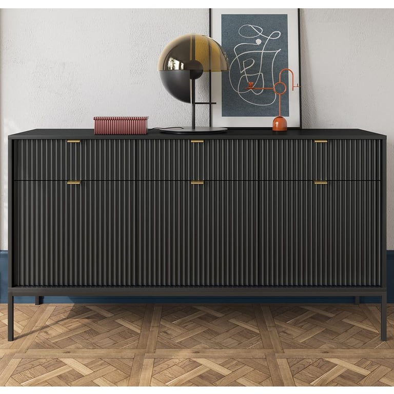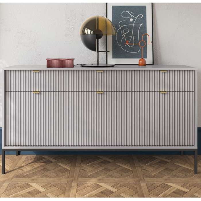 The sideboard NIVA draws attention with its elegance and enhances to look of any living room, bedroom, or hall. The fronts have a unique design on them as they have a 3D texture on them. They proudly decorate modern interiors, beautifully presenting themselves against the background of a loft and glamor style arrangements.