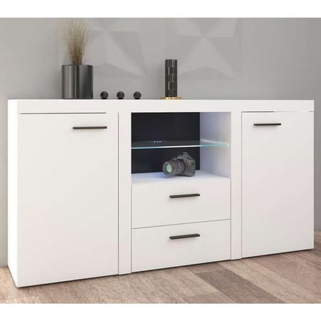 The RAMBA sideboard in white combines sleek design with practical storage. It features spacious cupboards, drawers for organisation, and a stylish glass shelf illuminated by LED lighting. Perfect for adding a modern touch to any room, this sideboard offers both elegance and functionality.