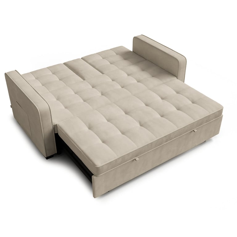 The sofa features a convenient click-clack mechanism that allows it to transform effortlessly into a bed. With a simple adjustment, the backrest folds down to create a flat sleeping area measuring 153 cm by 182.5 cm. Hidden legs are cleverly folded into the backrest and unfold when turning the sofa into a bed, providing additional support.This mechanism makes it easy to switch between seating and sleeping configurations, offering a practical solution for guests or compact living spaces.