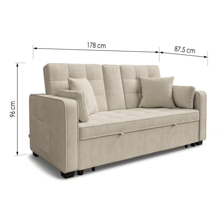 The sofa bed measures 178 cm in width, 87.5 cm in depth, and stands 96 cm tall. These dimensions ensure ample seating space during the day and a comfortable sleeping area at night, making it a versatile choice for any living space.
