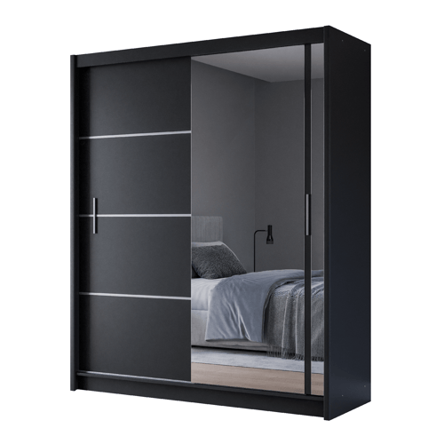 The wardrobe features two stylish sliding doors: one with a full-length mirror for added functionality, and the other adorned with three elegant strips for a modern touch. Designed for convenience and aesthetic appeal, its smooth sliding mechanism ensures easy access while enhancing your room's contemporary look.