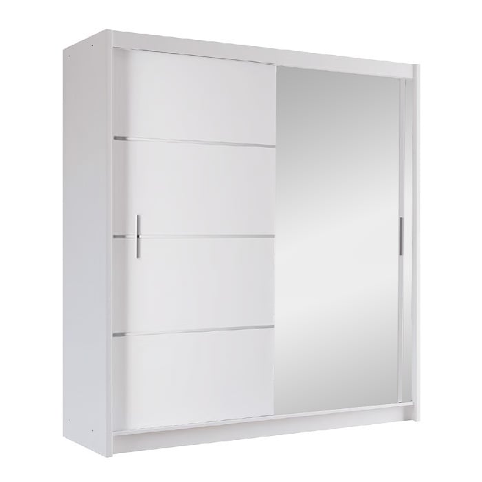 The VISTA 203cm mirrored sliding door wardrobe in white combines style and practicality, featuring a spacious design with eight shelves for organised storage and two sturdy hanging rails for clothing. Its sleek finish and durable construction make it a versatile addition to any bedroom or storage space.