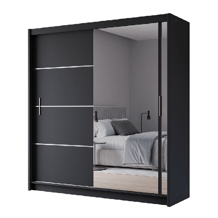 The VISTA mirrored sliding door wardrobe (203cm) in black features spacious shelves, and hanging rails, offering style and practicality for organised storage.