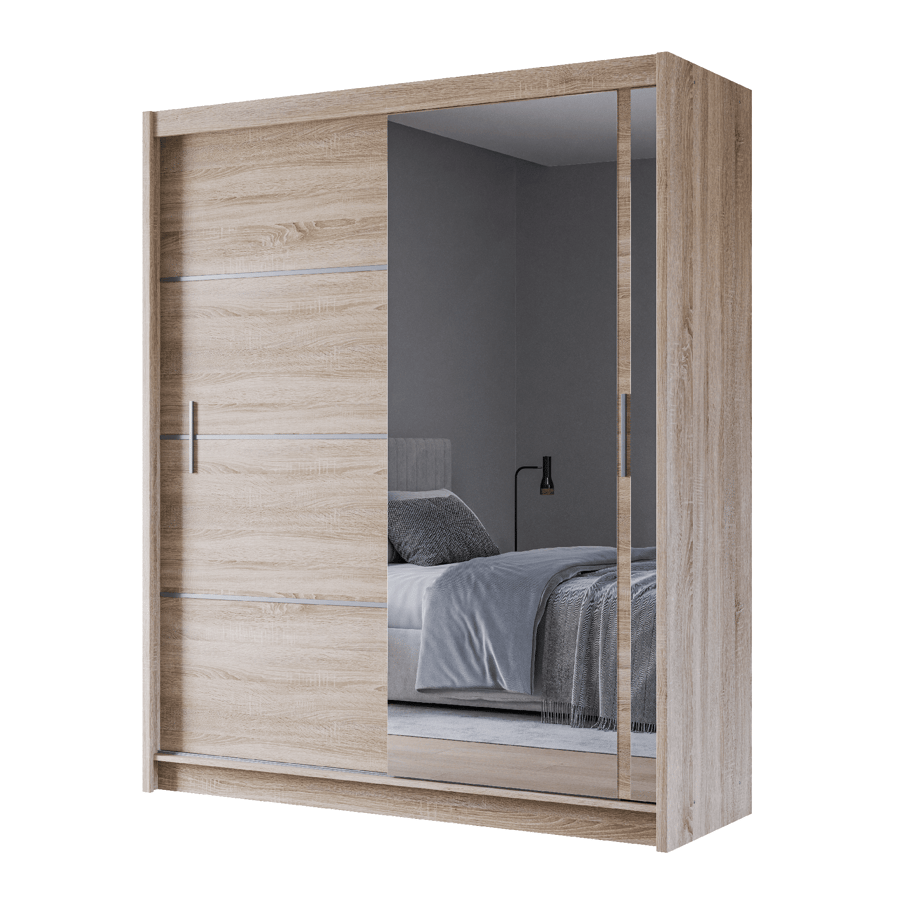 The wardrobe features two stylish sliding doors: one with a full-length mirror for added functionality, and the other adorned with three elegant strips for a modern touch. Designed for convenience and aesthetic appeal, its smooth sliding mechanism ensures easy access while enhancing your room's contemporary look.