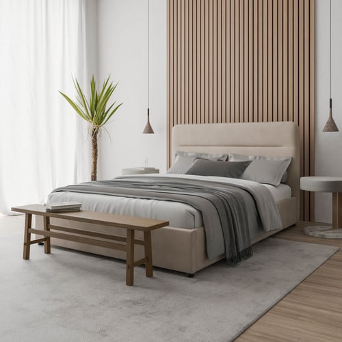 EVERETT beige upholstered bed in double size with tall softly padded headboard, under bed storage and modern design.