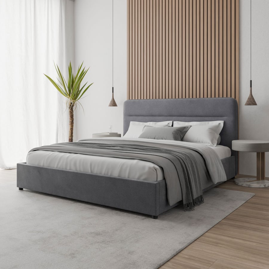 EVERETT grey upholstered bed in super king size with tall softly padded headboard, under bed storage and modern design.