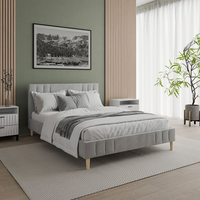 The JAXON bed is the perfect blend of contemporary design and practical comfort. Its minimalist silhouette, upholstered finish, and soft, vertical-stitched headboard create a timeless look that suits both modern and classic interiors. The bed stands on tall, natural wooden legs, which give it a light, airy appearance and make cleaning underneath easy – a stylish and functional detail that sets Jaxon apart.